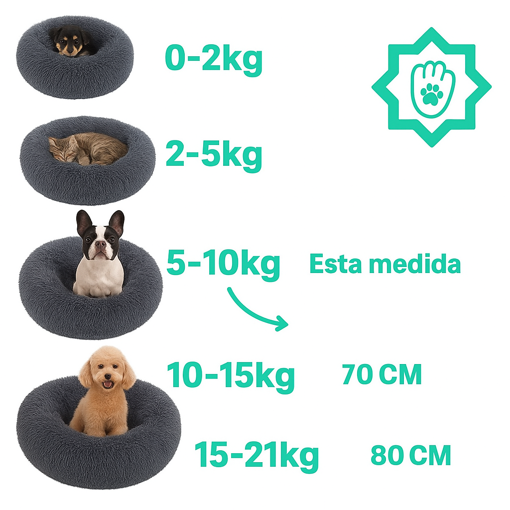 - Solución: 60cm de diámetro diseñados específicamente para mascotas de 5-10kg. El tamaño perfecto para que se acurruque cómodamente sin sentirse perdido.